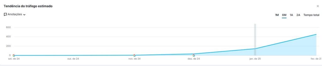Em apenas 5 meses, passamos de 1 para 144 acessos orgânicos, registrando um crescimento de 14.300%. Além disso, em dezembro de 2024, registramos 33 acessos e, no mês seguinte, tivemos um aumento expressivo de 336%, consolidando o avanço contínuo da estratégia.
