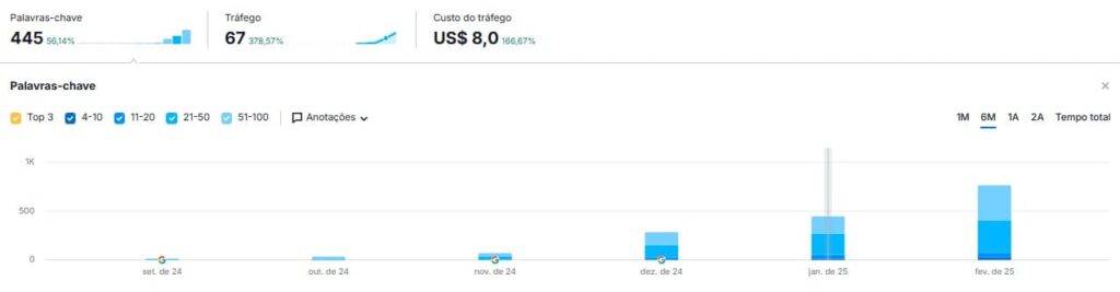 Em setembro de 2024, começamos a estratégia de SEO do início, com apenas 14 palavras-chave indexadas. Atualmente, já alcançamos 445, o que representa um aumento de 3.078%.